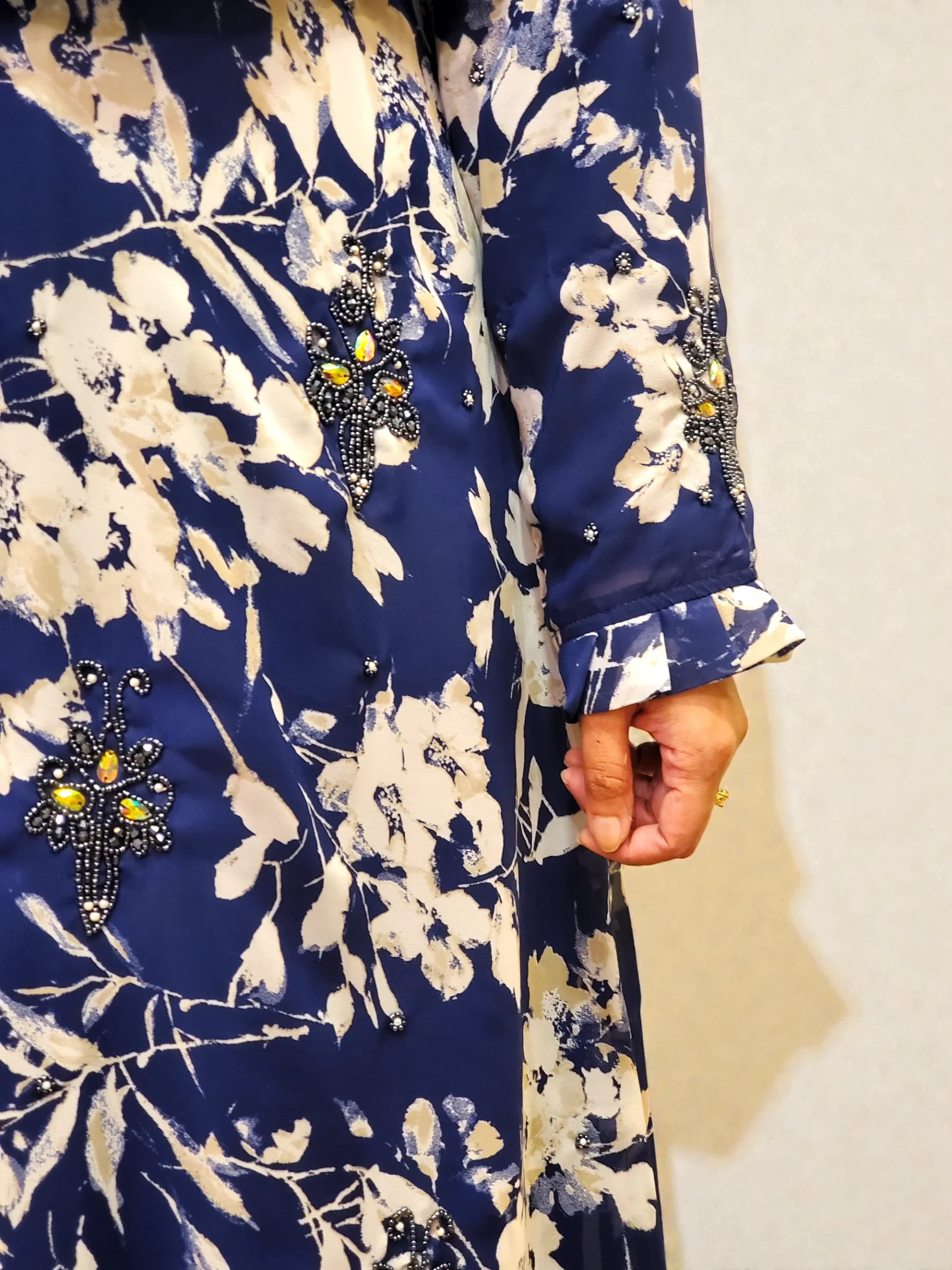 প্রিন্টের কারচুপি কিমোনো। সফট ট্রান্সপারেন্ট জর্জেট ম্যাটেরিয়ালের ওপর কারচুপি করা আছে