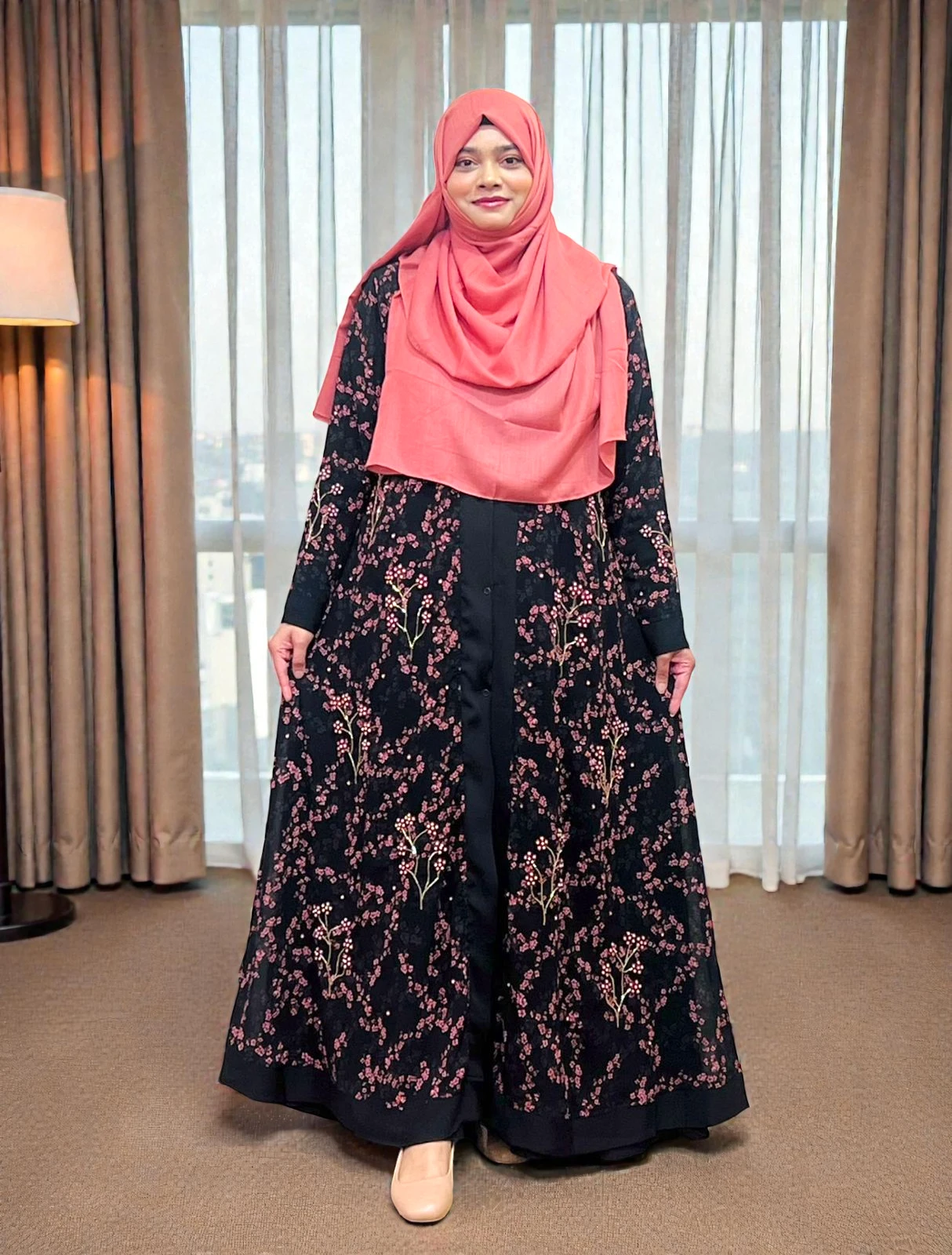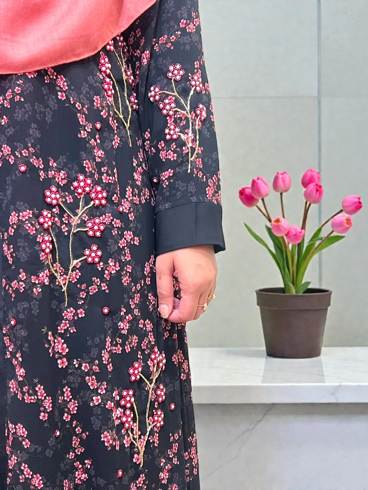 এই কিমোনোটি তৈরি করা হয়েছে সফট ট্রান্সপারেন্ট জর্জেট ম্যাটেরিয়াল দিয়ে, যার উপর সামনে ও হাতায় করা হয়েছে নিখুঁত কারচুপি কাজ। কারচুপির কাজগুলো খুবই পরিপাটি ও ক্লাসি, যা কিমোনোটিকে আরও আকর্ষণীয় ও প্রিমিয়াম লুক দিয়েছে। প্রিন্টের সাথে কারচুপির কম্বিনেশনটা দেখতে খুবই সুন্দর ও ট্রেন্ডি।