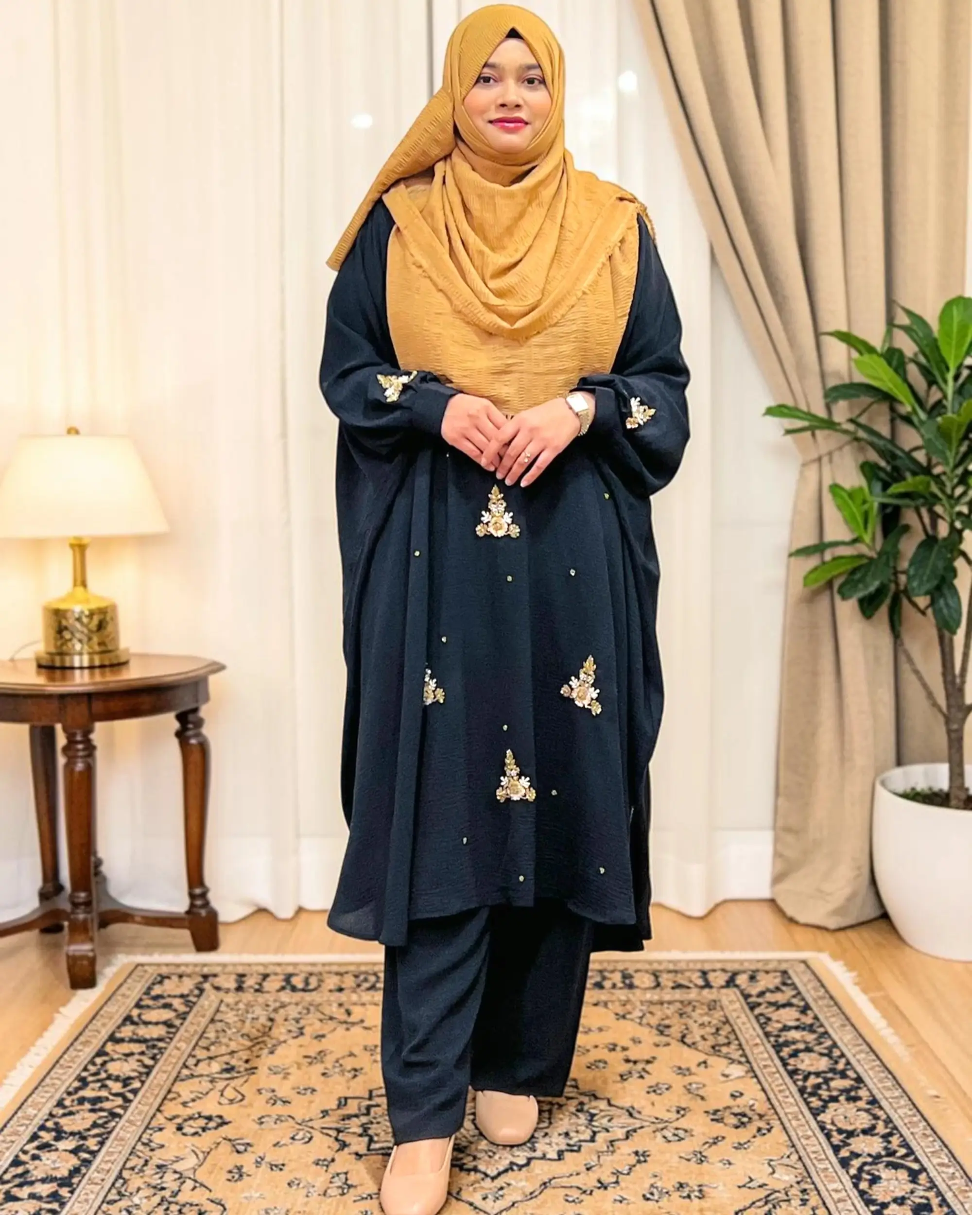 কারচুপি কো-অর্ড সেট | নন ট্রান্সপারেন্ট সফট জাফরান কেপ + প্যান্ট সেট quantity