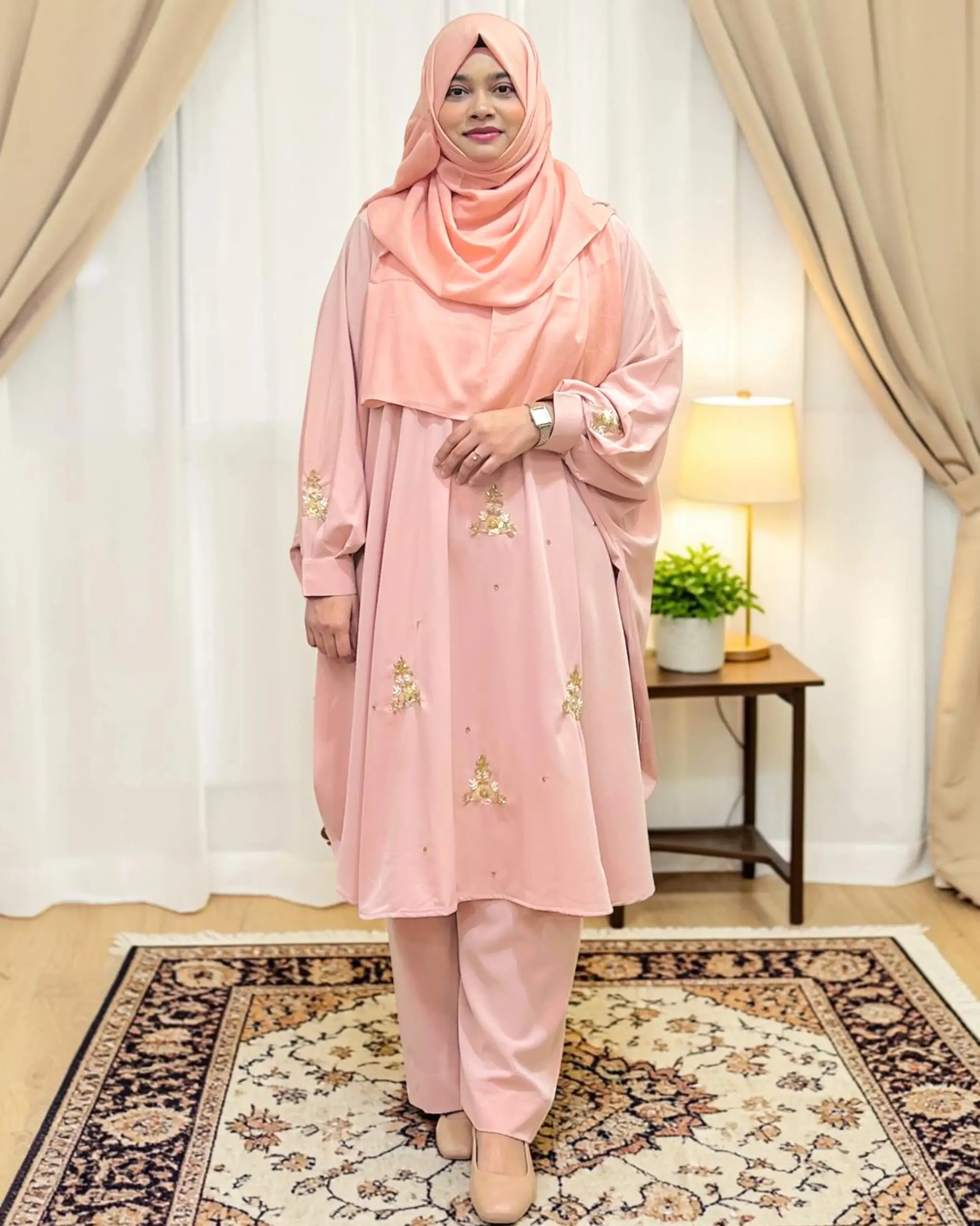 প্রিমিয়াম কারচুপি কো-অর্ড সেট | জাফরান কেপ ও প্যান্ট | কমফোর্টেবল ফ্রি সাইজ ড্রেস quantity