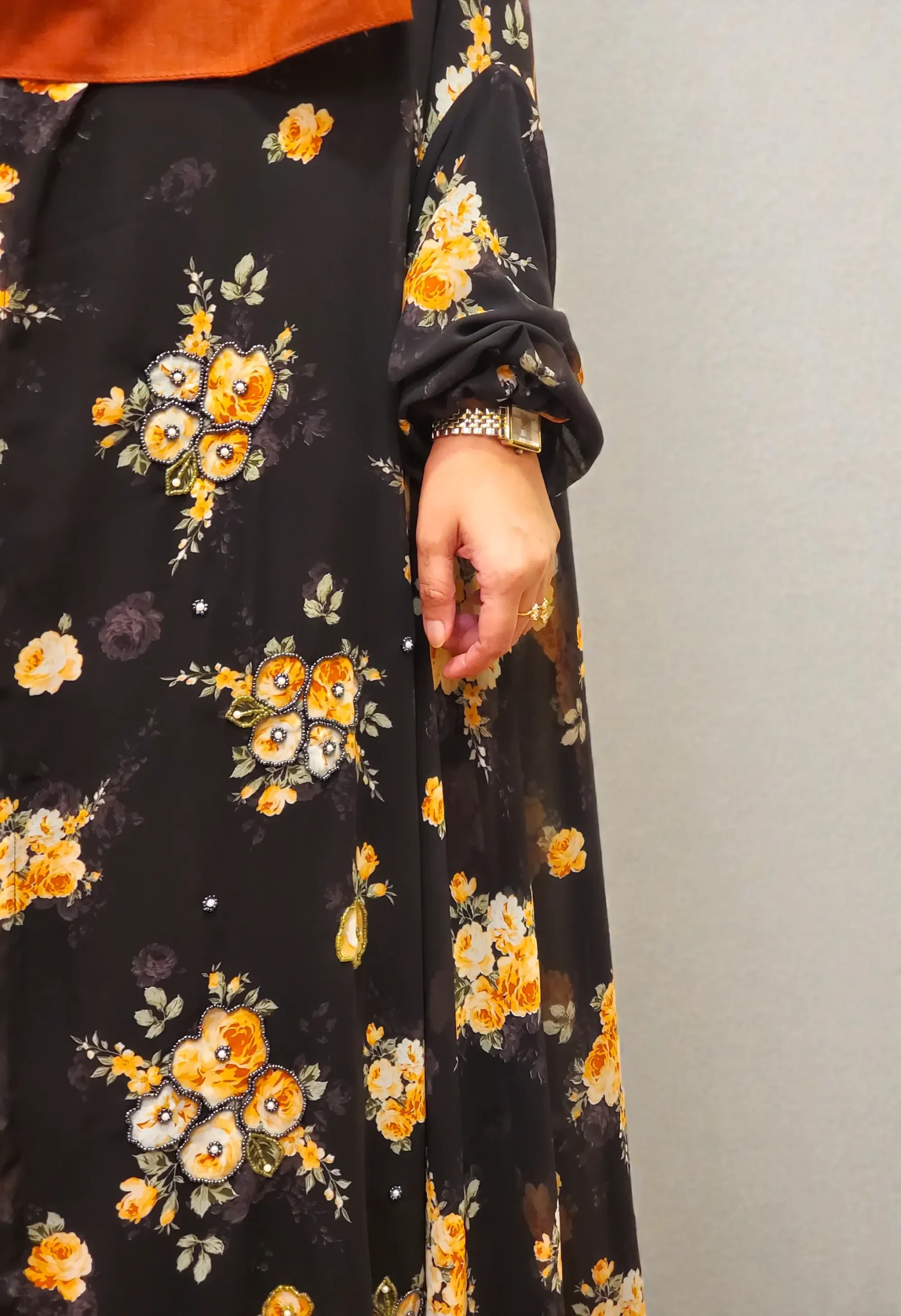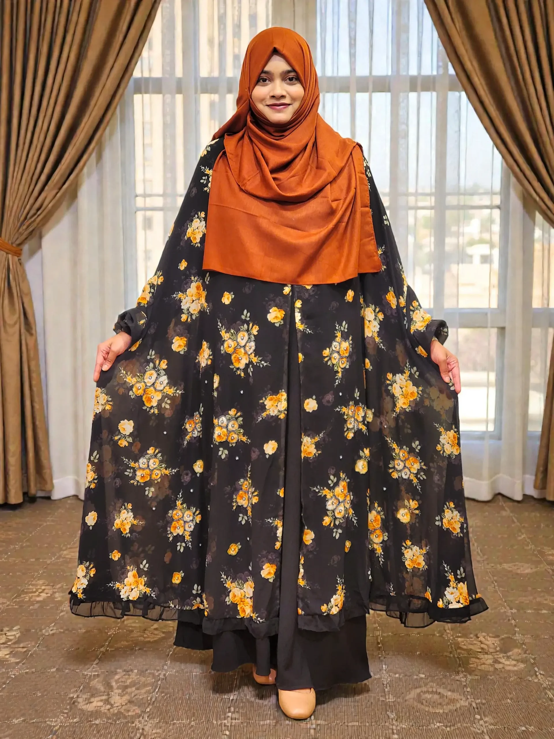 খুব সুন্দর একটা প্রিন্ট সাথে আছে কারচুপি কাজ। কারচুপি কাজ টা খুবই নিখুঁত ও ক্লাসি। কেপের নিচে ফ্রিল দেয়া আছে। ফ্রি সাইজ ট্রান্সপারেন্ট সফট জর্জেট ম্যাটেরিয়াল। একদম খিমার কেপের মতোই শুধু সামনে কাটা আছে। এই কেপ টা খুব কমফোর্টেবল ও সামার ফ্রেন্ডলি হবে আপুরা। কামিজ, ইনার বা শাড়ির সাথে সহজেই পরতে পারবেন ইন শাহ আল্লাহ। অর্ডার কনফার্ম করতে ইনবক্স করুন পেইজে।