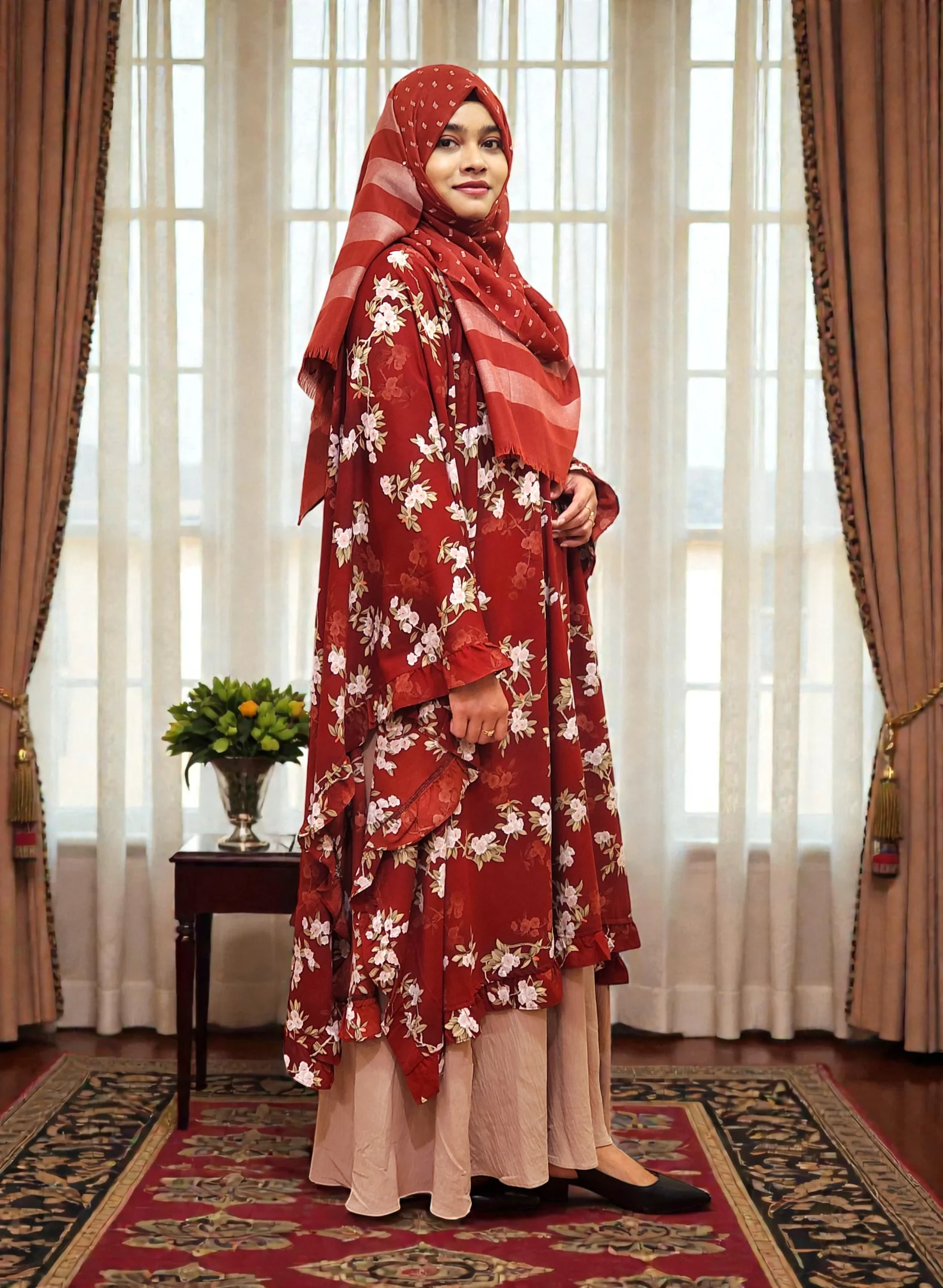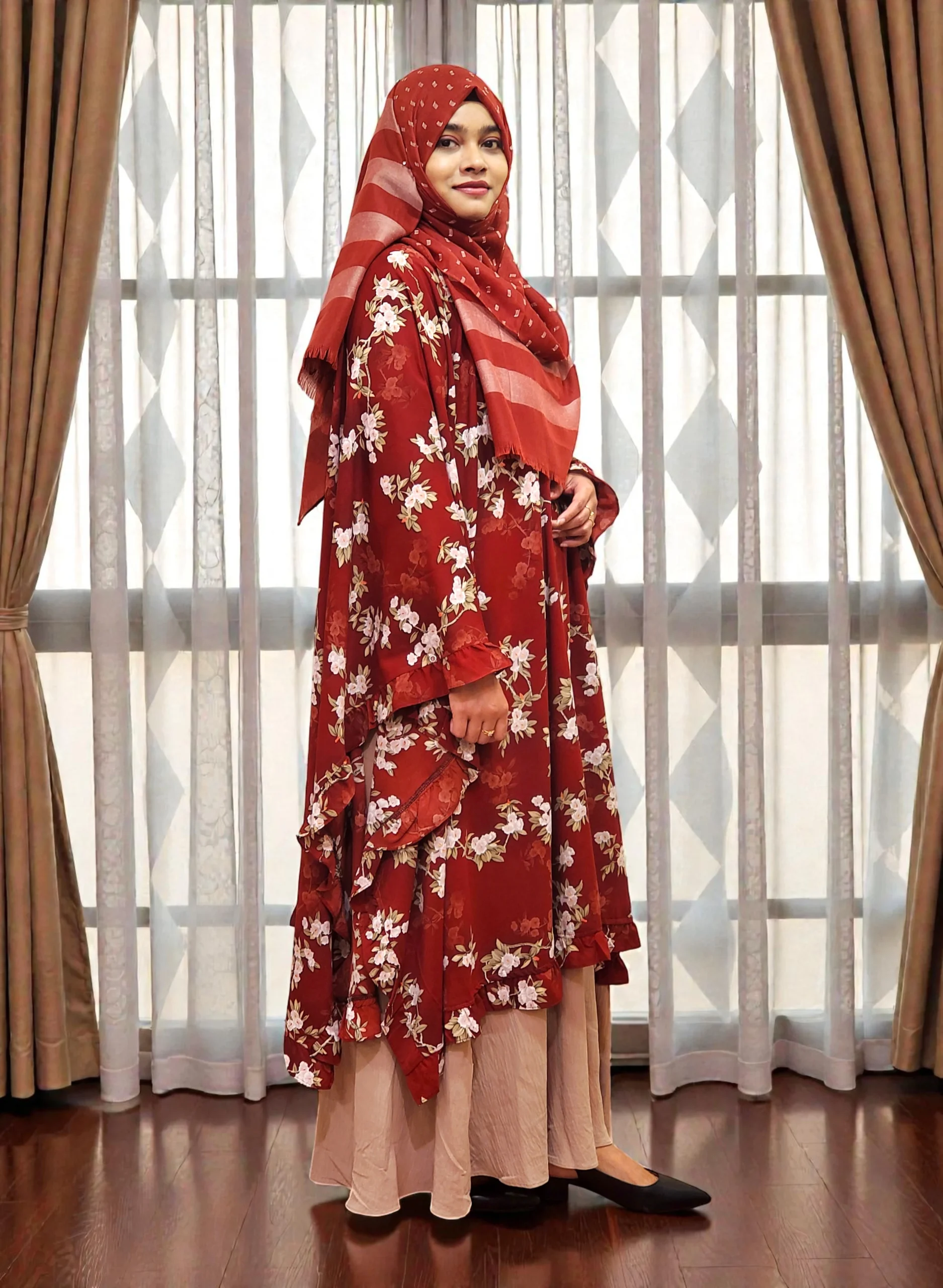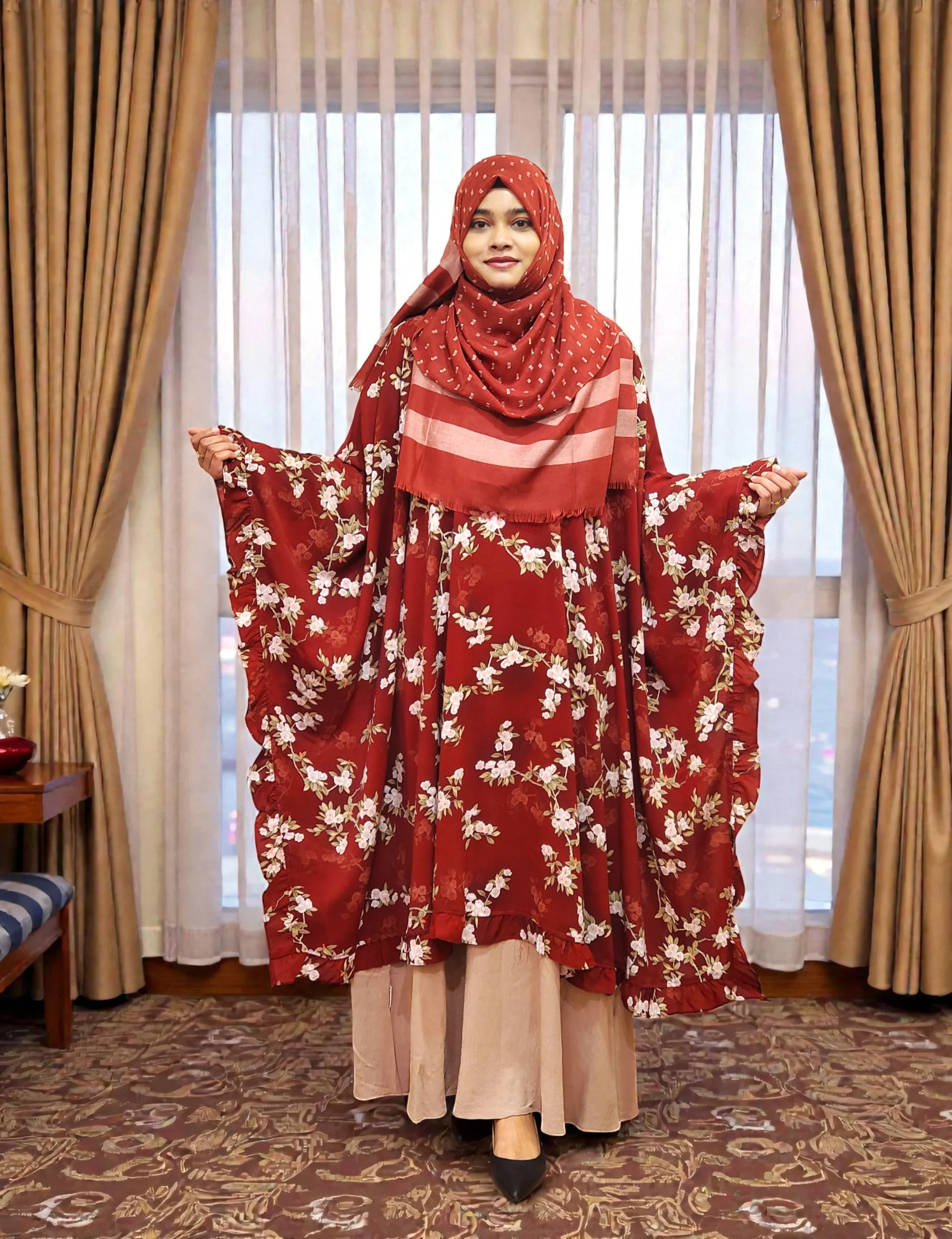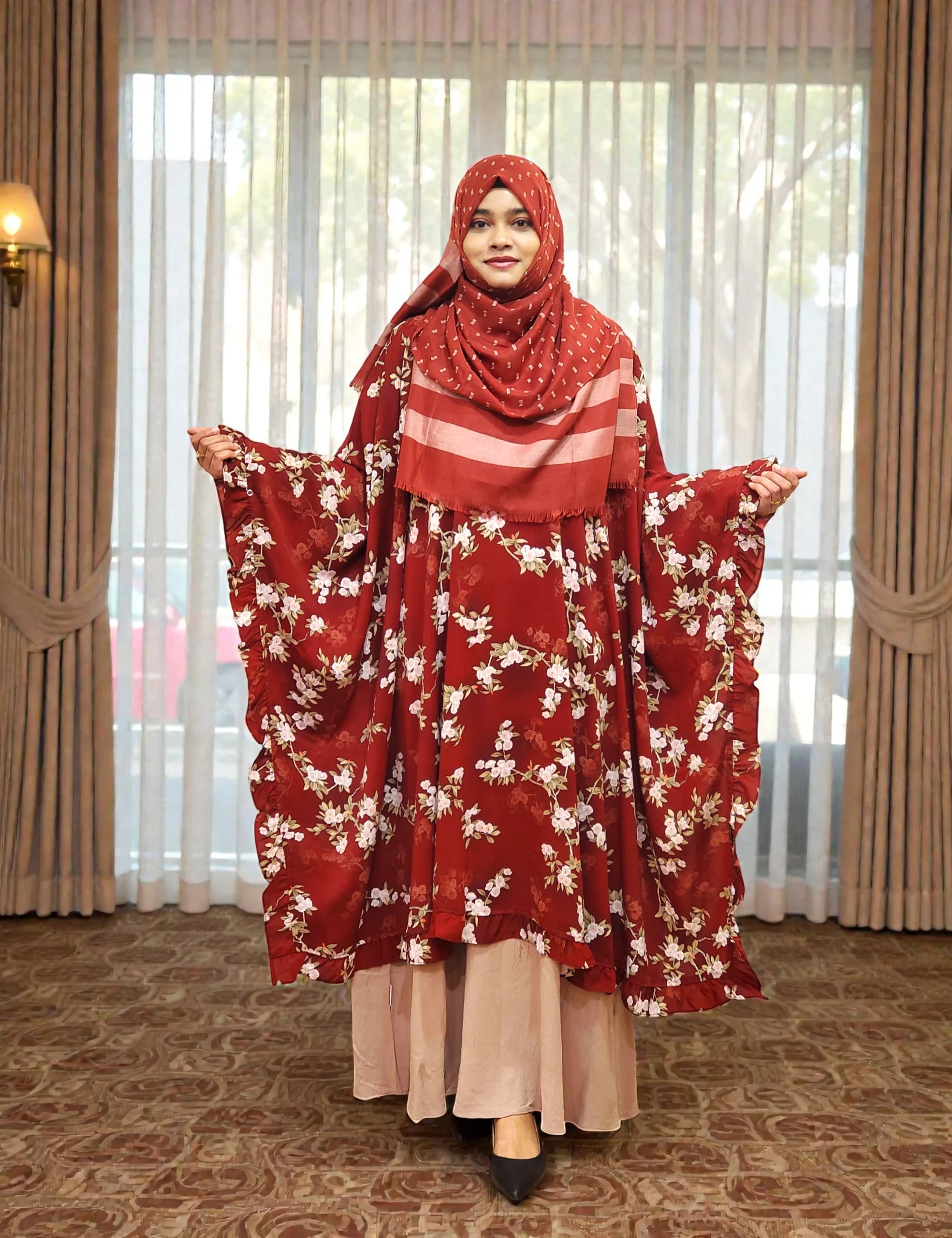 এই কেপটি চারকোনা স্টাইল এবং চারপাশে সুন্দর ফ্রিল ডিটেইল আছে, যা দেখলে একদম ক্লাসি ও এলিগ্যান্ট লুক দেয়।