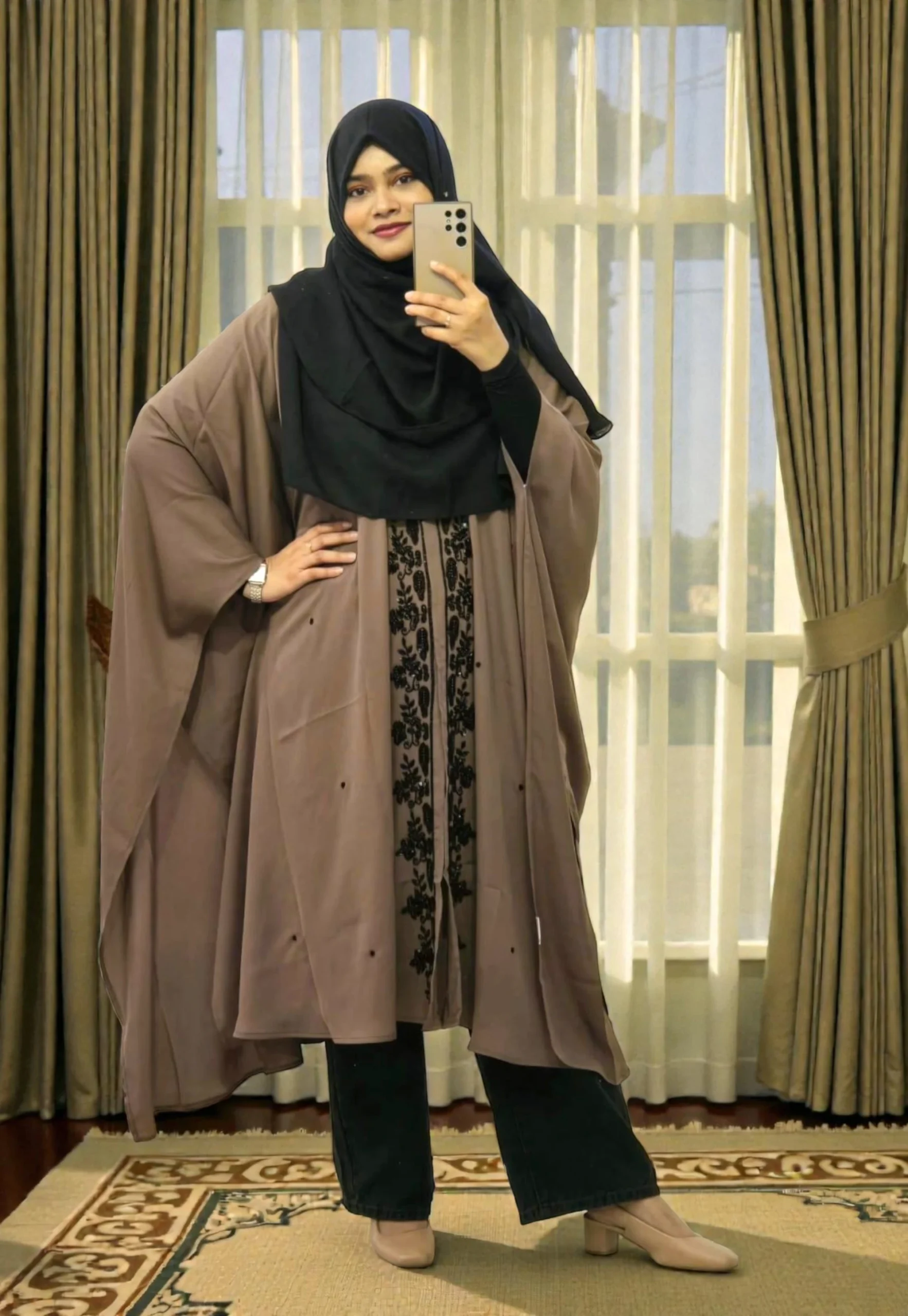 এই কারচুপি কেপ গুলো এখন আমাদের বেস্ট সেলিং আলহামদুলিল্লাহ। আবারও নতুন গর্জিয়াস কারচুপি কেপ স্টকে এসেছে। নিখুঁত কারচুপির কাজ গুলো এক কথায় অসাধারণ। কেপ গুলো ফ্রি সাইজ। নন ট্রান্সপারেন্ট দুবাই চেরি ম্যাটেরিয়ালের তৈরী। সাইড প্রোফাইল লকড না, খোলা। সামনে খোলা, একটি বাটন দেয়া আছে। কামিজ, শাড়ি বা ইনার যে কোনো কিছুর সাথে সহজেই পরে ফেলতে পারবেন ইন শাহ আল্লাহ।