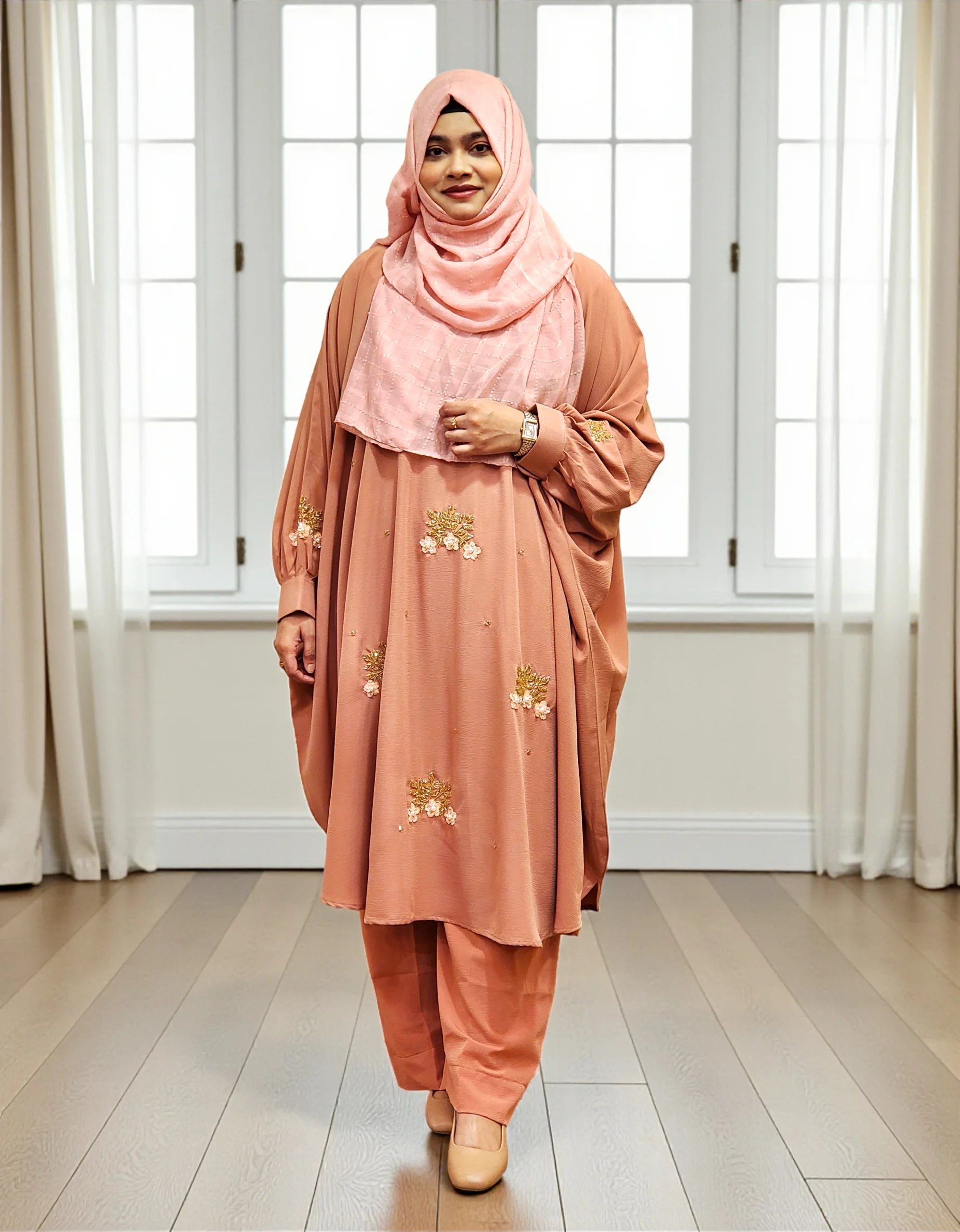 Co-ord outfits or set dresses have become a favored favorite for the modern woman who appreciates convenience as much as she values style. The greatest appeal of a co-ord set is absolute hassle-free dressing; one needn’t spend time matching tops with bottoms. Just slip into the set, team it up with your favorite hijab, and you’re instantly ready with a classy, well-coordinated look. The creation is intended just for that ease with this karchupi work cape+ pant co-ord, combining beautiful craftsmanship with unbeatable comfort.