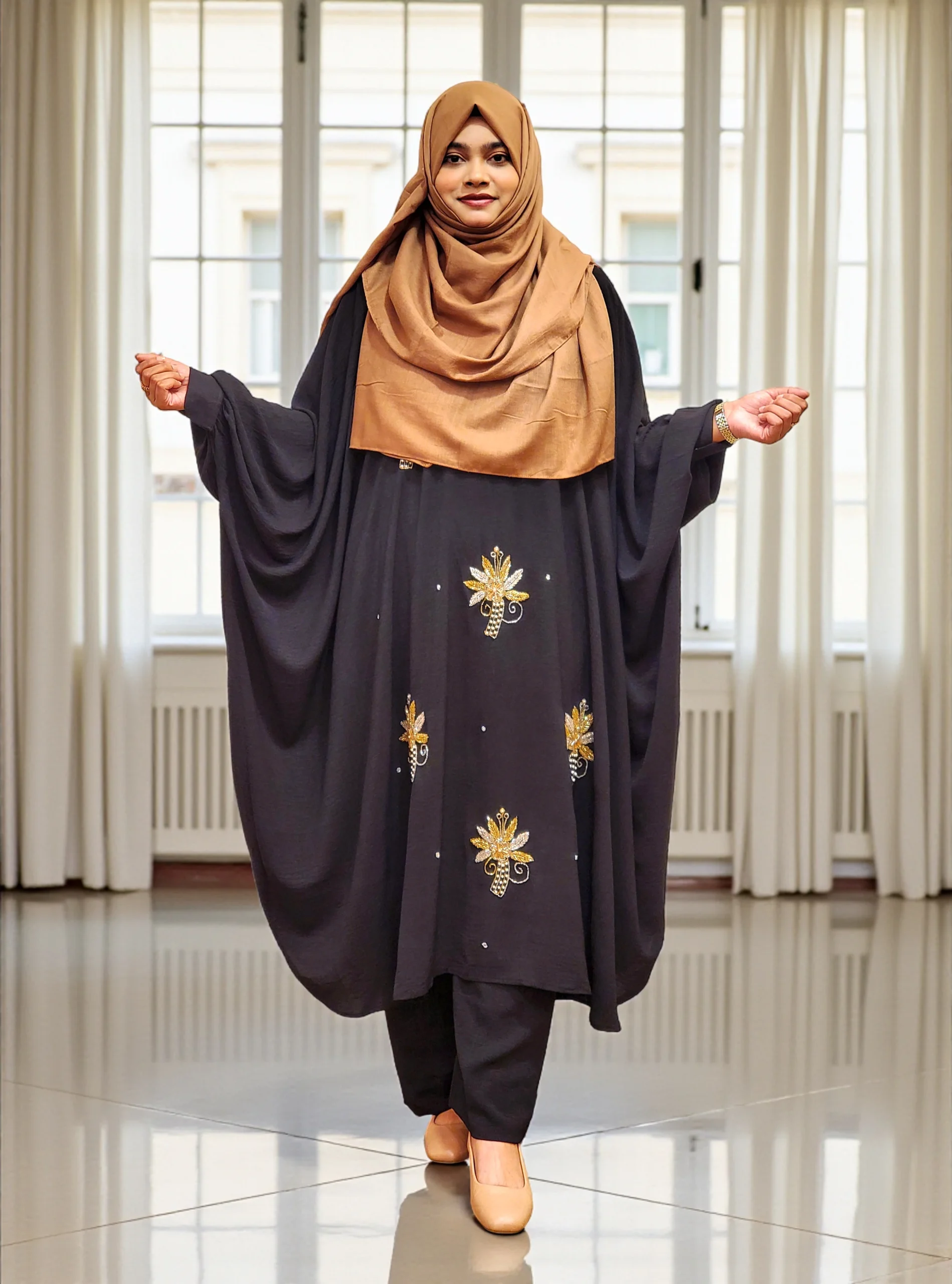Set dresses or co-ord outfits have become darling favorites for the women who consider ease and style simultaneously. The greatest charm of a co-ord set is its absolute hassle-free dressing wherein one does not have to match any top with a bottom. Just slip into the set, pair it with your favorite hijab, and instantly you are ready with a classy, well-coordinated look. The karchupi work cape + pant co-ord is meant to bring that ease, blending beautiful craftsmanship with unbeatable comfort.
