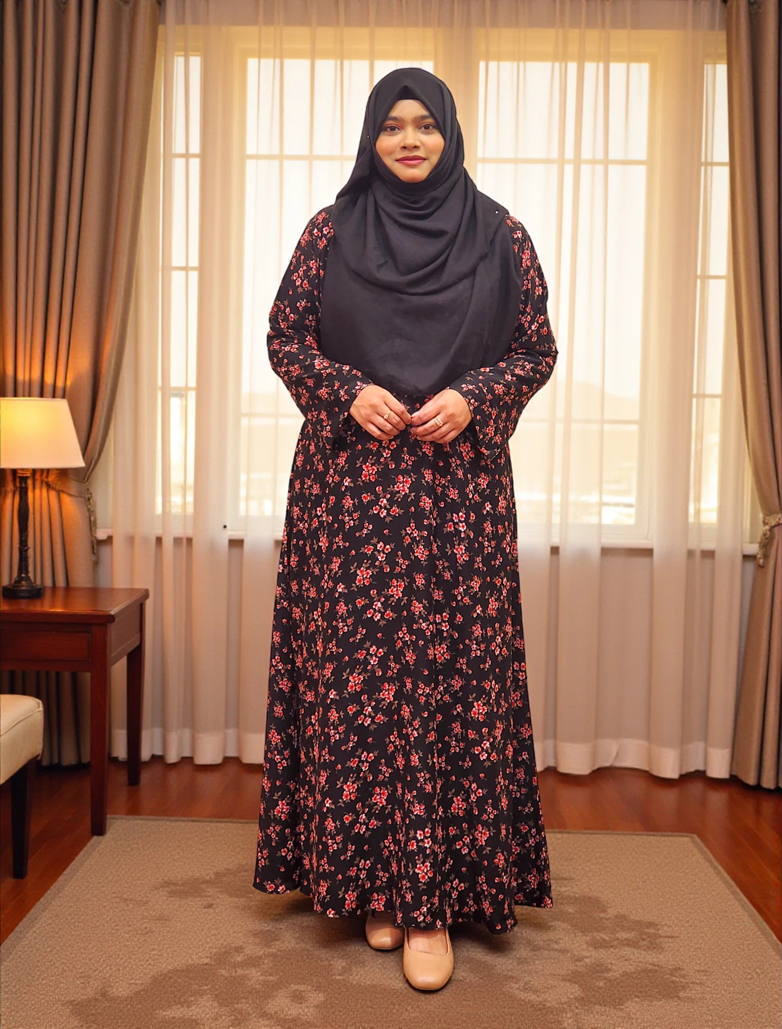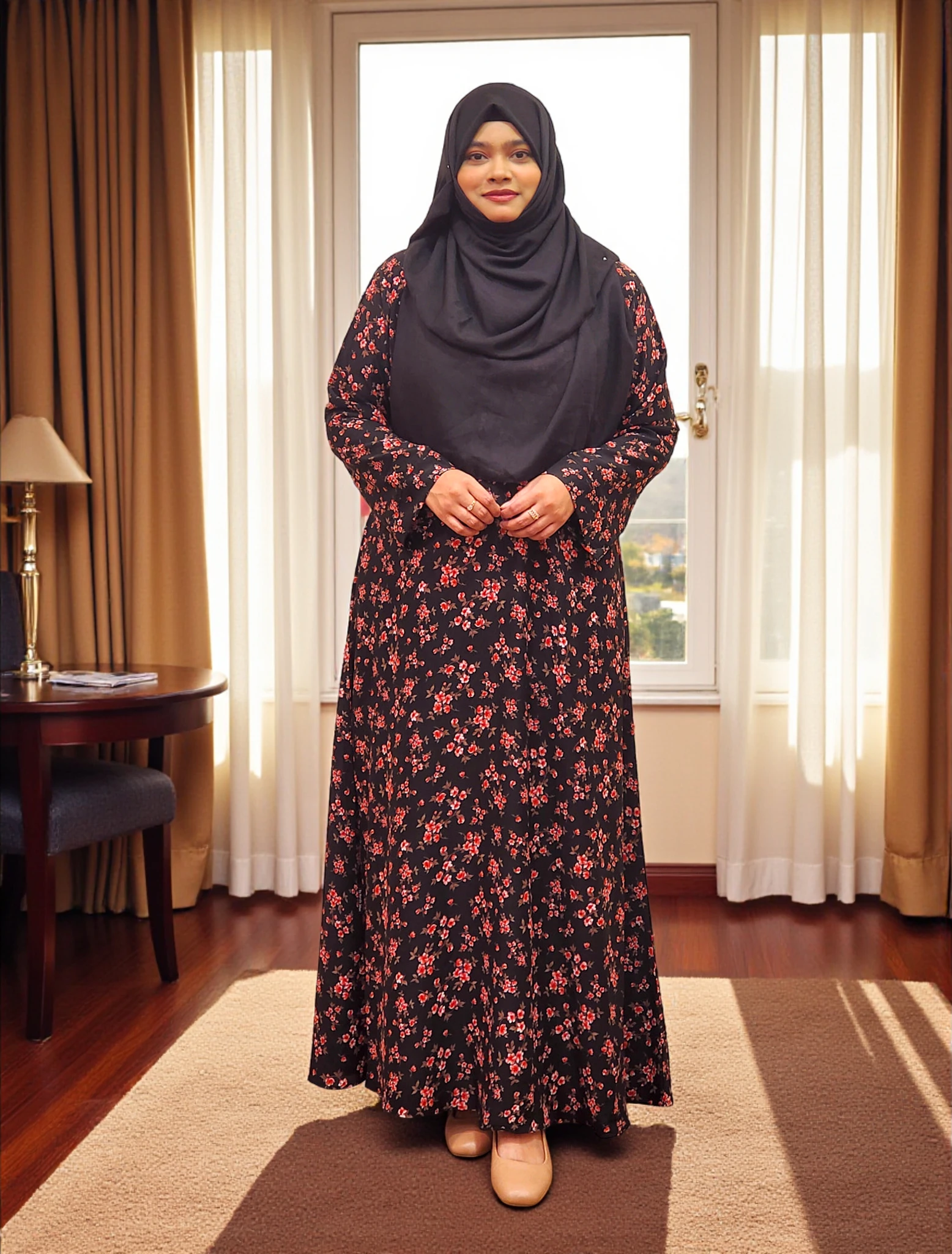অস্বচ্ছ নরম অ্যালেক্স কাপড় দিয়ে তৈরি মুদ্রিত বোরখা। ডান দিকে একটি পকেট আছে।