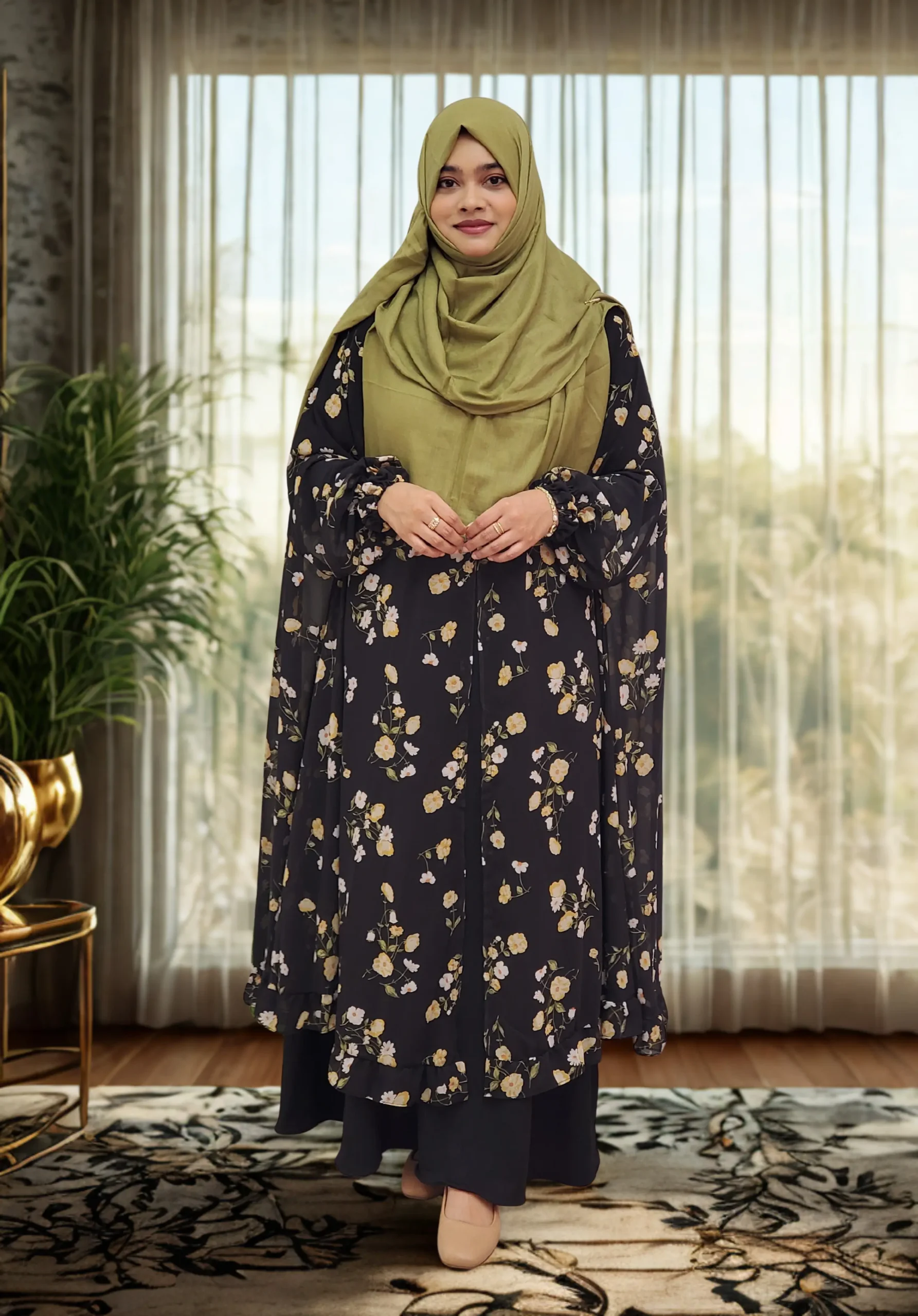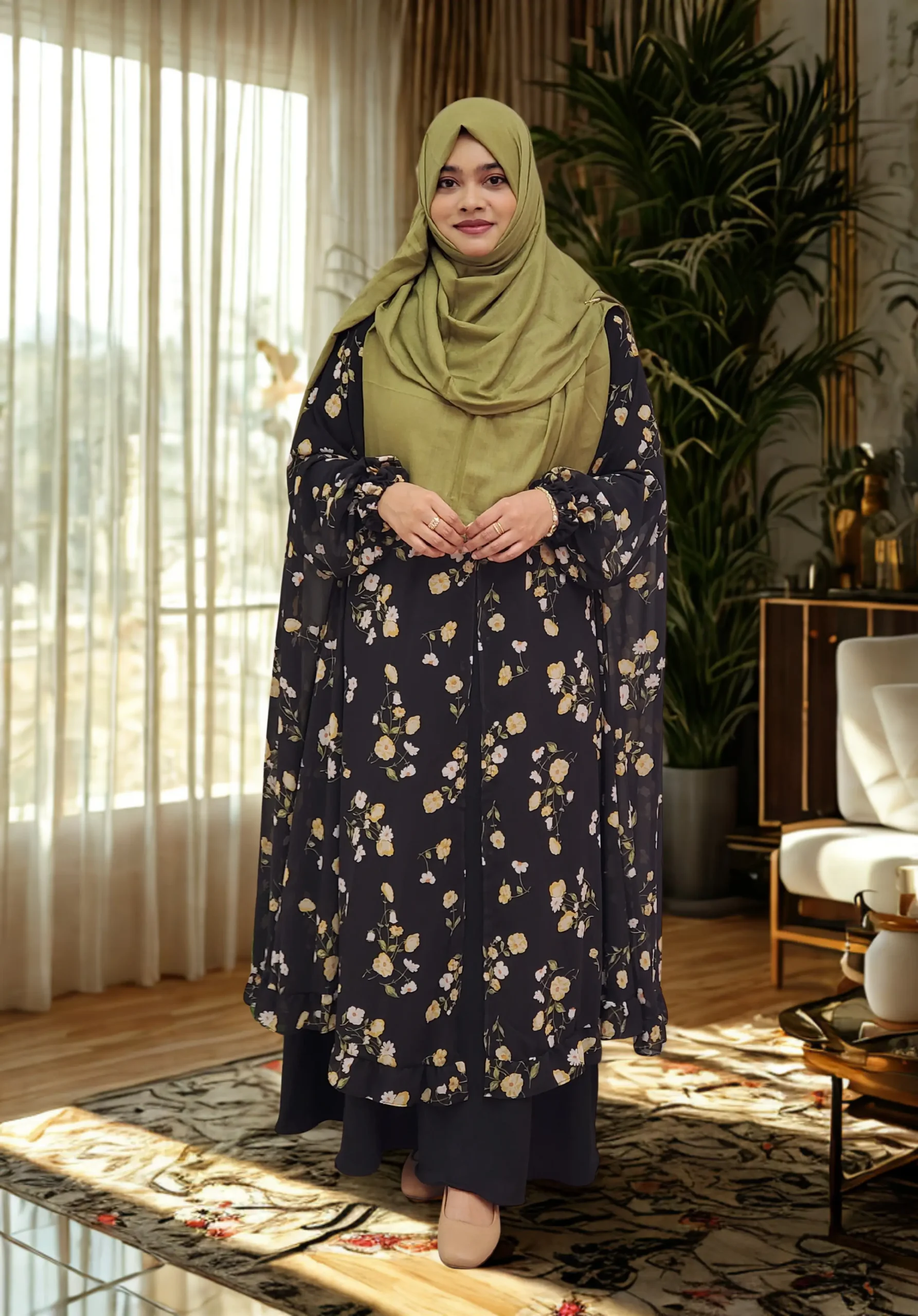 This cape’s transparency with a delicate printed design is one of its best features. It’s stylish enough to instantly improve your appearance when worn over an abaya, inner dress, or even a basic ensemble. To create fresh looks each time you wear it, try layering it with striking accessories, matching hijabs, or solid-colored inners. Because of this, you can wear it to semi-formal events as well as casual get-togethers.