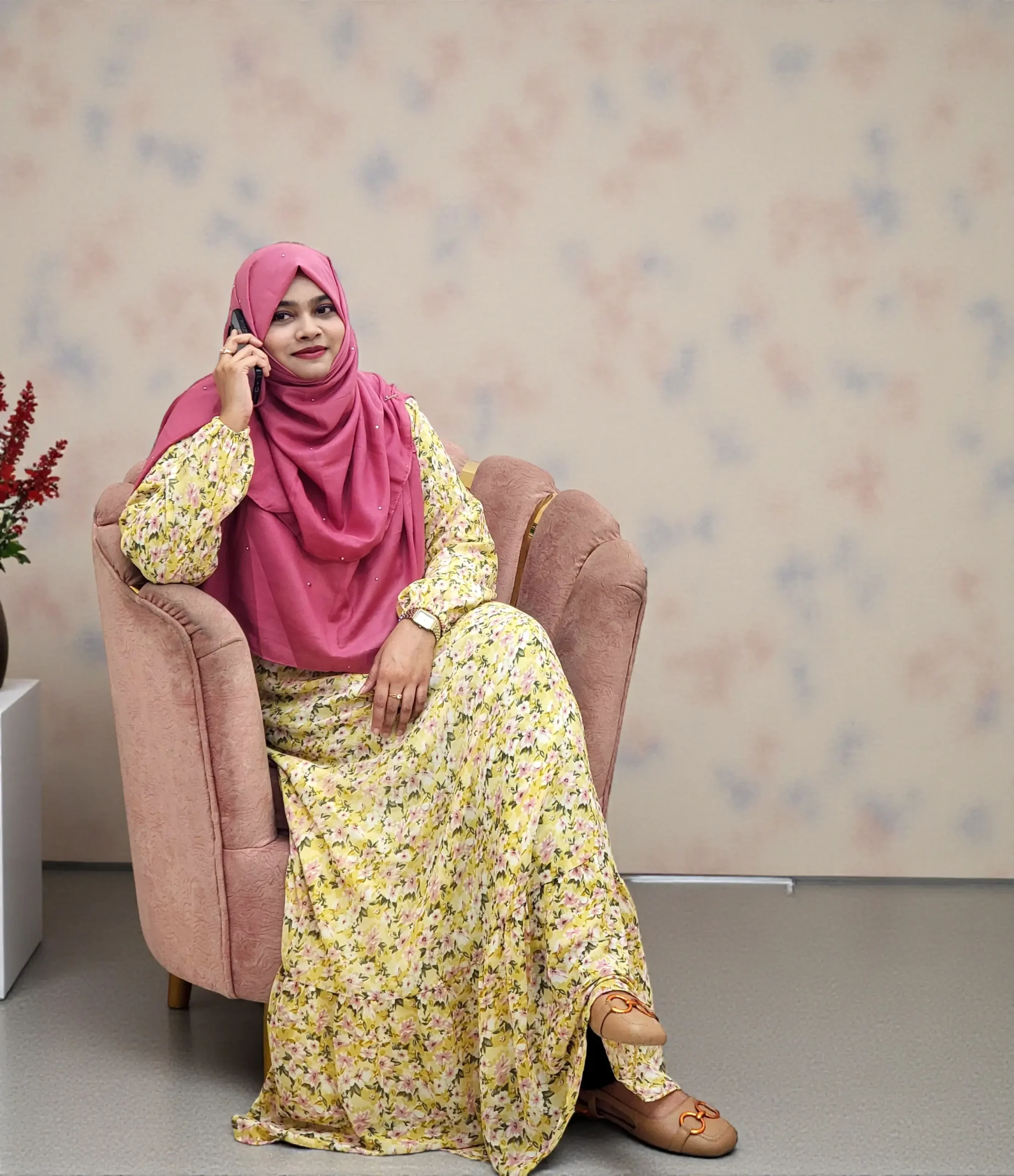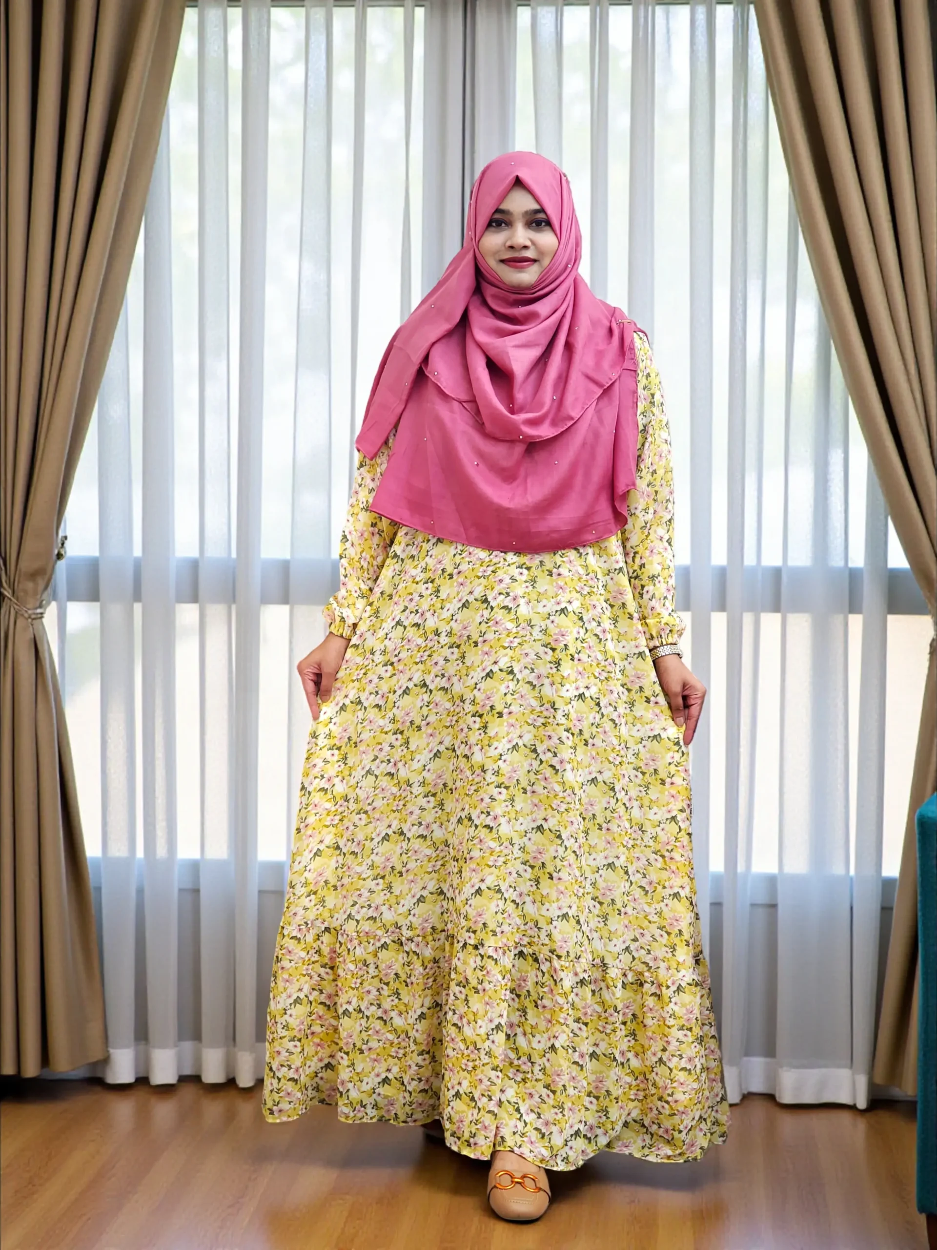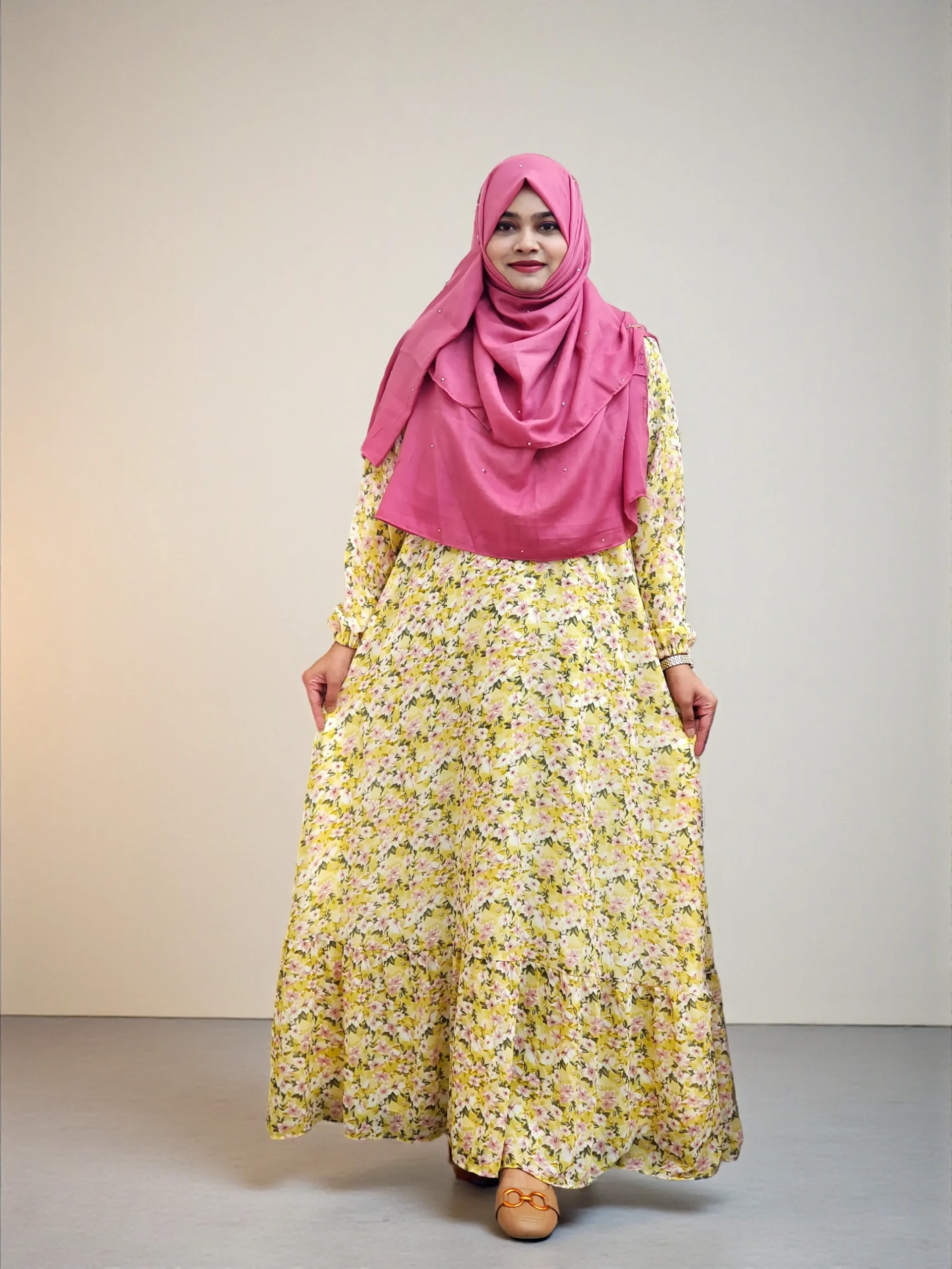 প্রিন্টেড ডাবল পার্ট গাউন। এক কাটে তৈরি। এর নীচে একটি লম্বা ফ্রিল এবং একটি স্লিট রয়েছে।