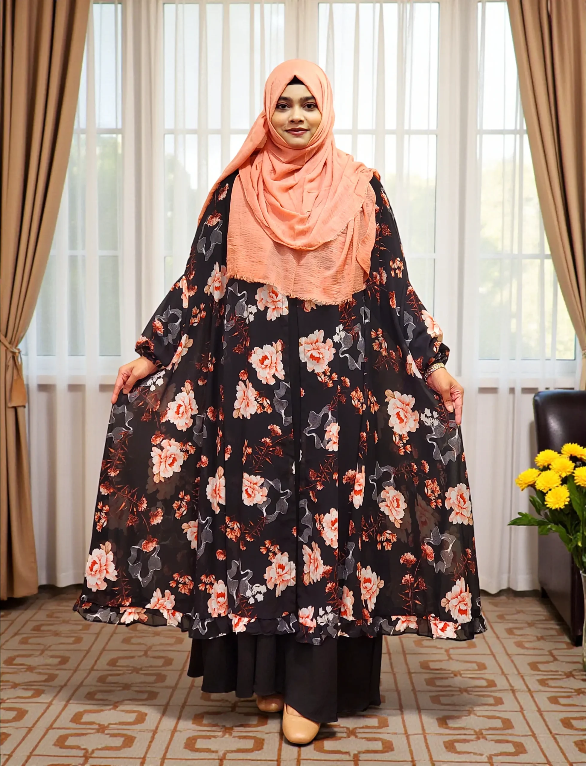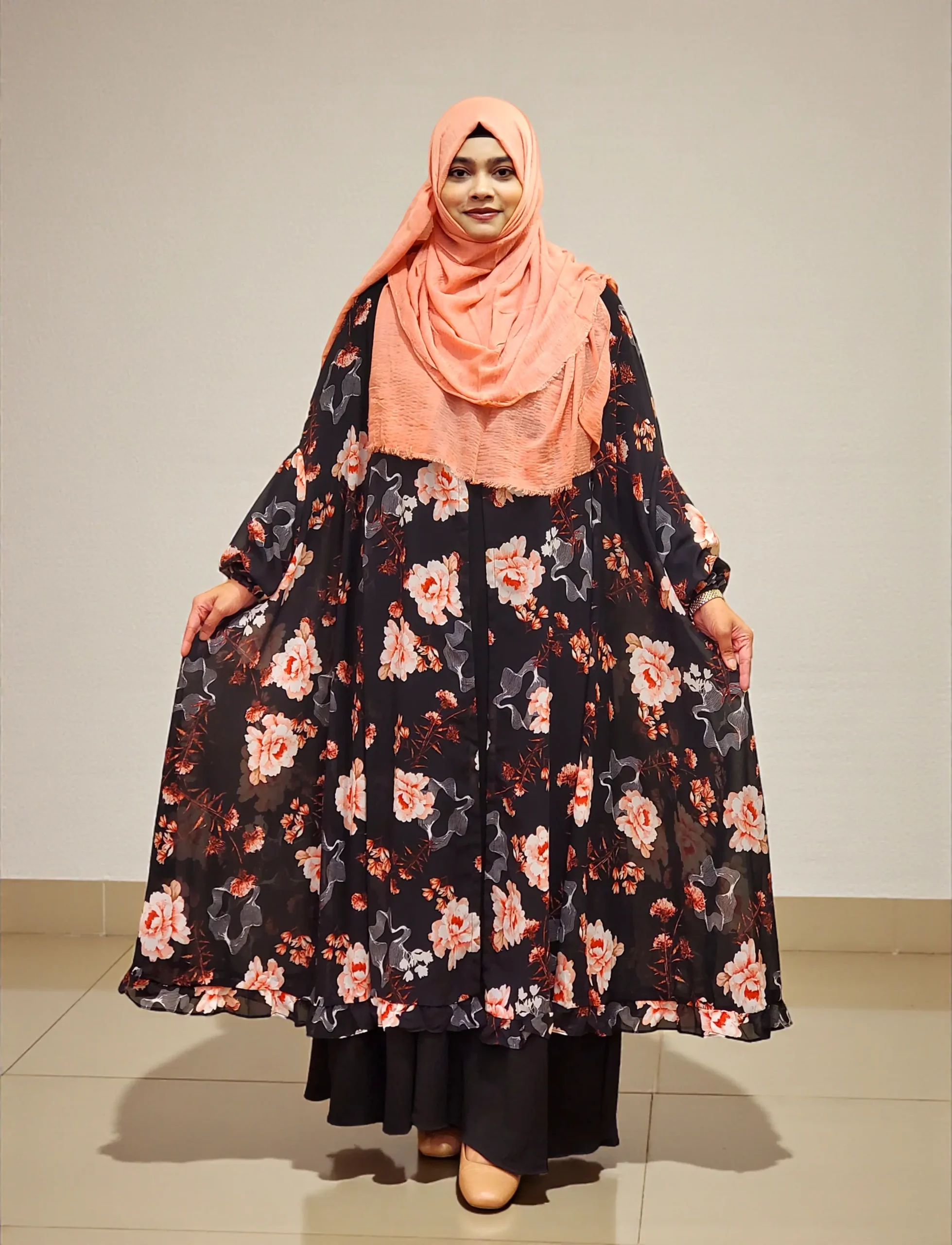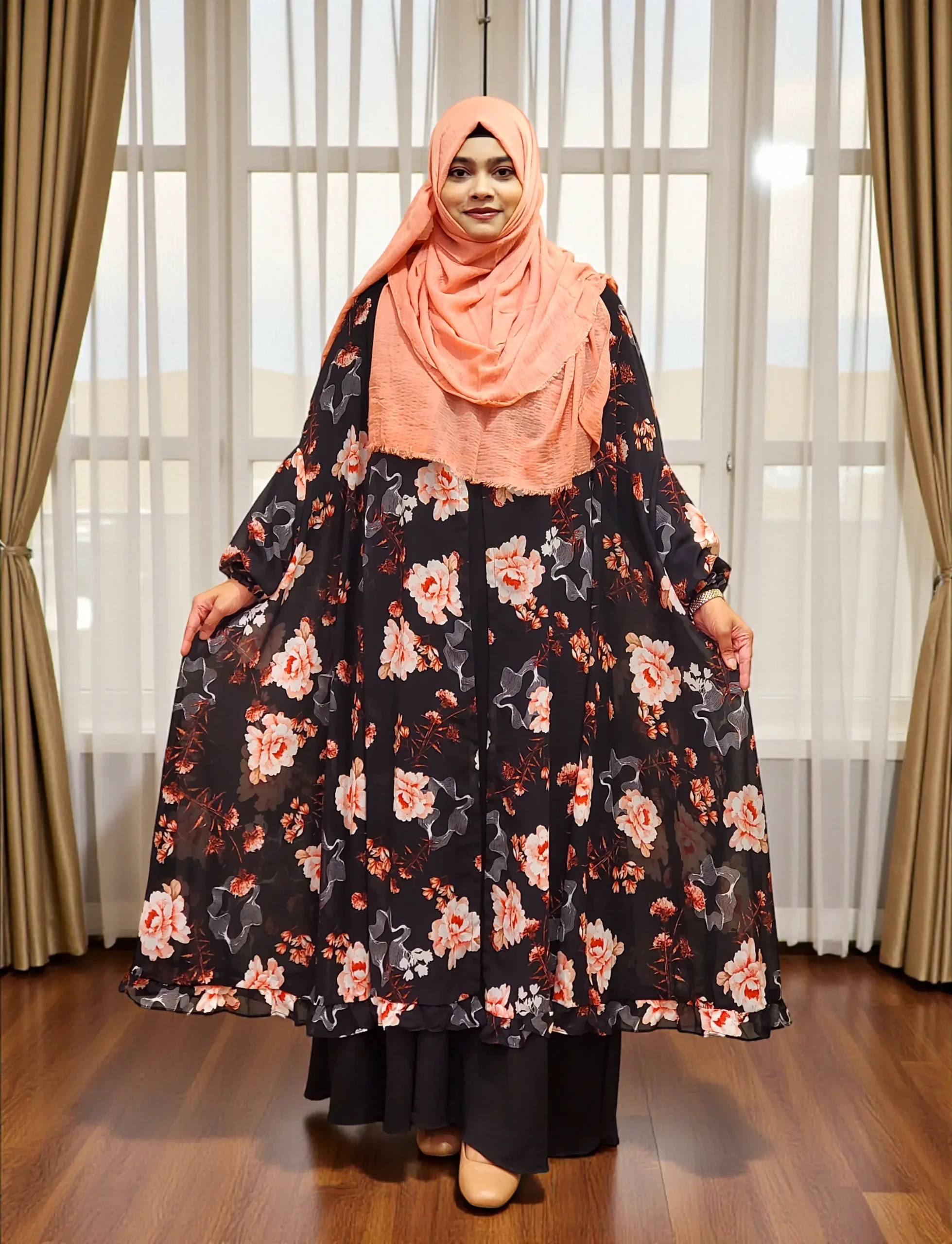 মুদ্রিত ফিউশন কেপ, ফ্রি সাইজ এবং স্বচ্ছ নরম জর্জেট প্রিন্ট দিয়ে তৈরি।